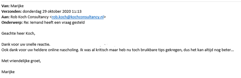 ... verder was de training erg leuk opgezet met veel humor. Dat is ook wel nodig want anders wordt men waarschijnlijk wel wat angstig. Persoonlijk merkte ik ook dat wijzelf er waarschijnlijk veel te technisch reageren op gebruikersvragen op dit gebied. Daarmee dring je niet door tot de mensen. Reden te meer om een training als deze aan te bevelen.